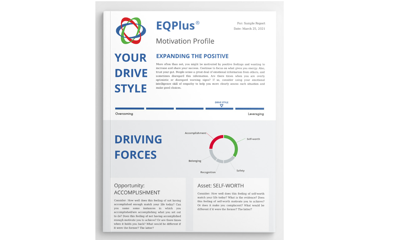 EQPlus® Motivation Profile là một công cụ hoàn hảo vì có thể ứng dụng vào hành động ngay lập tức, có thể dễ dàng nhận biết những Động lực Nội Tại nào đang tạo nên sự thành công hiện tại - và điều gì đang cản trở. Sử dụng dữ liệu này, Bạn có thể ứng dụng thay đổi mạnh mẽ giúp nhanh chóng đạt được thành công, ngoài ra còn hỗ trợ người khác trong việc nâng cao thành công giúp tăng hiệu suất của đội nhóm và tổ chức mình.
