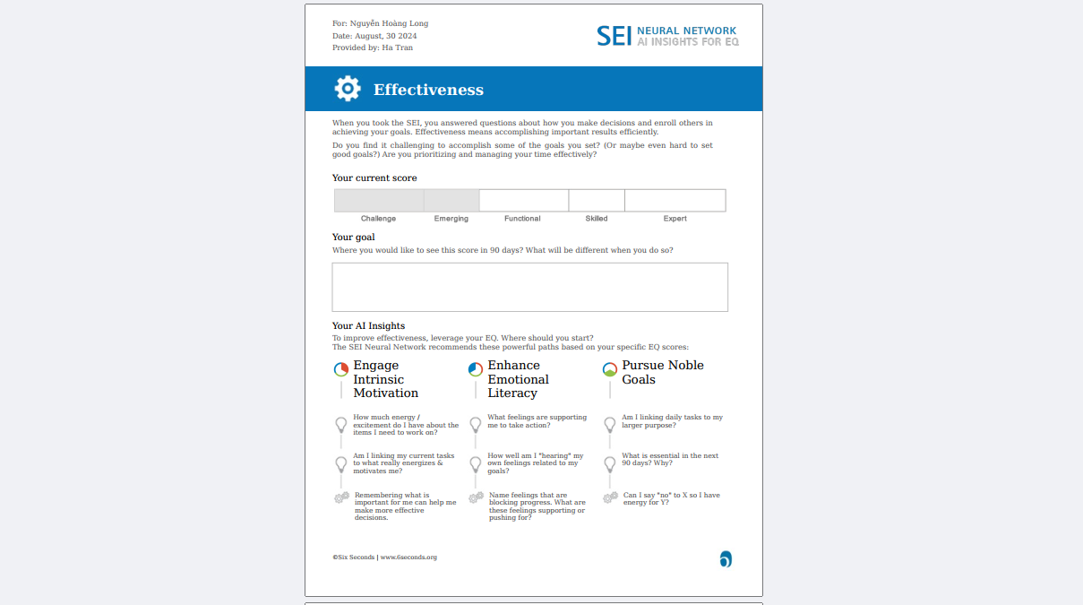 SEI DR cung cấp cho Bạn phản hồi toàn diện về trí tuệ cảm xúc hiện tại của mình và cách phát triển nó. Báo cáo được thiết kế dành cho tất cả mọi người, SEI DR cung cấp cho Bạn những hiểu biết về ứng dụng EQ trong sự nghiệp và cuộc sống.